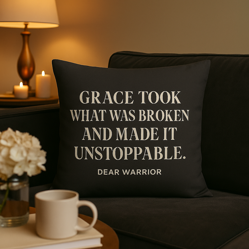 Bring comfort and inspiration into your space with this beautifully designed pillow that declares: “Grace Took What Was Broken and Made It Unstoppable.”